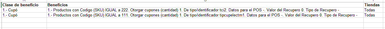 La primera línea del Excel deberá mostrar el título de las columnas de cada uno de los campos de cada promoción, tal como se muestran en el informe de promociones.