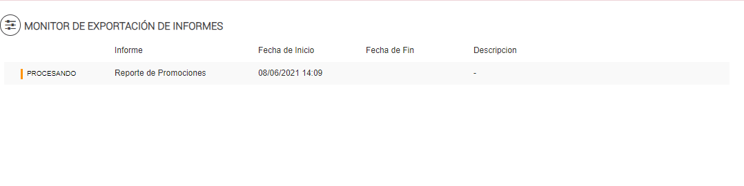 También se suma, a la descarga del informe a Excel (botón EXCEL: donde solo se descargarán los datos presentes por pantalla. Si no tiene registros estará deshabilitado), la posibilidad de realizar una exportación masiva de promociones. Esto permitirá descargar en un .csv con todos los datos que haya devuelto la consulta, no solo los que se muestren por pantalla. Al presionarlo, se redireccionara la pantalla al "Monitor de Exportaciones", en donde se mostrara el estado del informe requerido. Este informe sera descargado en la ruta destinada a tal fin desde la configuración central de Promo (en caso de inconvenientes para la exportación de este informe deberá contactarse al Servicio de Atención al Cliente Napse, para la revisión de las configuraciones centrales de la consola) y podrá accederse a través del ítem Descripción de la vista Monitor de Exportación de Informes.
