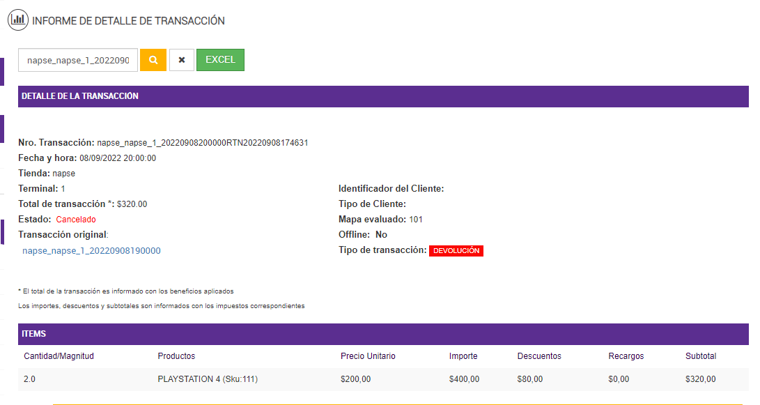| Tipo de Transacción | Indica si fue una SALE (venta) o RETURN (devolución). |