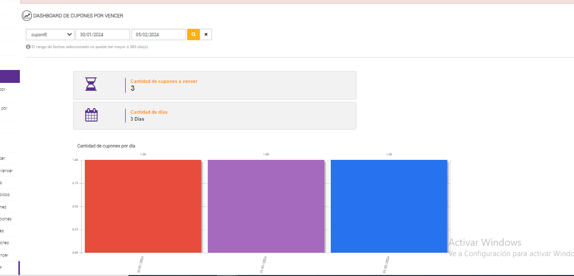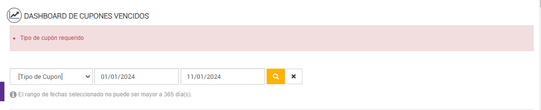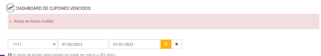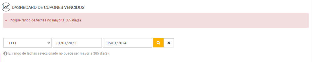 Si se seleccionar rangos de fechas mayores a 365 días, la aplicación enviará un mensaje de error: