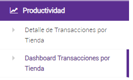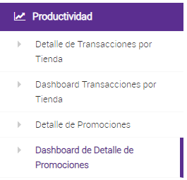 Para ingresar al mismo, se debe presionar el ítem "Dashboard de Transacciones por Tiendas" del menú Productividad de Promo