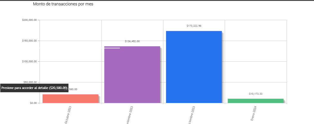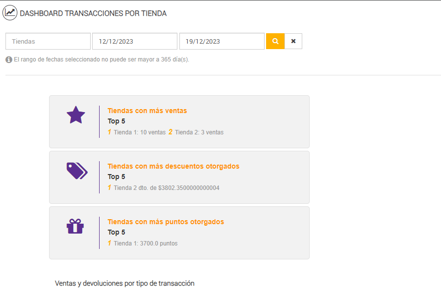 Permite visualizar gráficamente las tiendas con mayor monto en transacciones (ventas y devoluciones), en un período determinado.