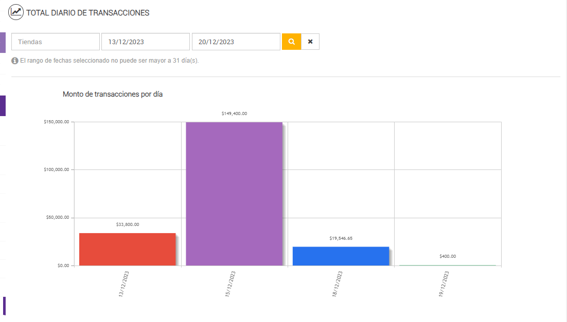 Permite obtener información gráfica de las transacciones realizadas por tiendas, en un período determinado.