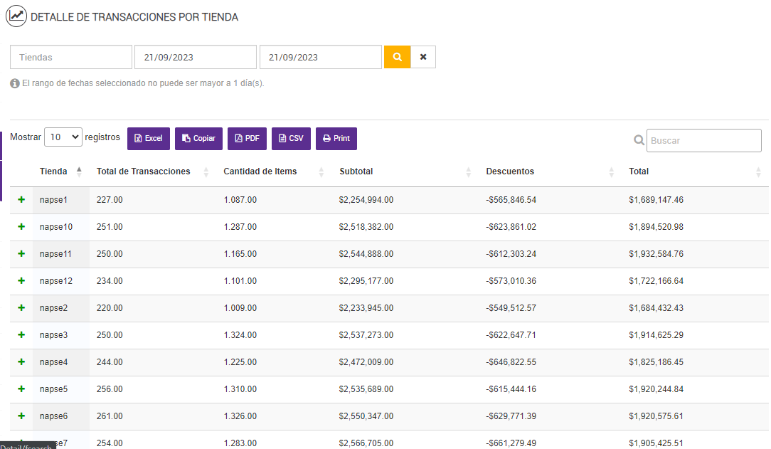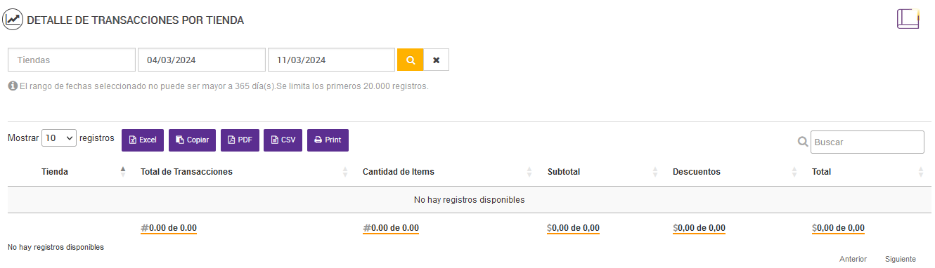 Permite obtener información detallada de las transacciones realizadas por tiendas, en un período determinado.