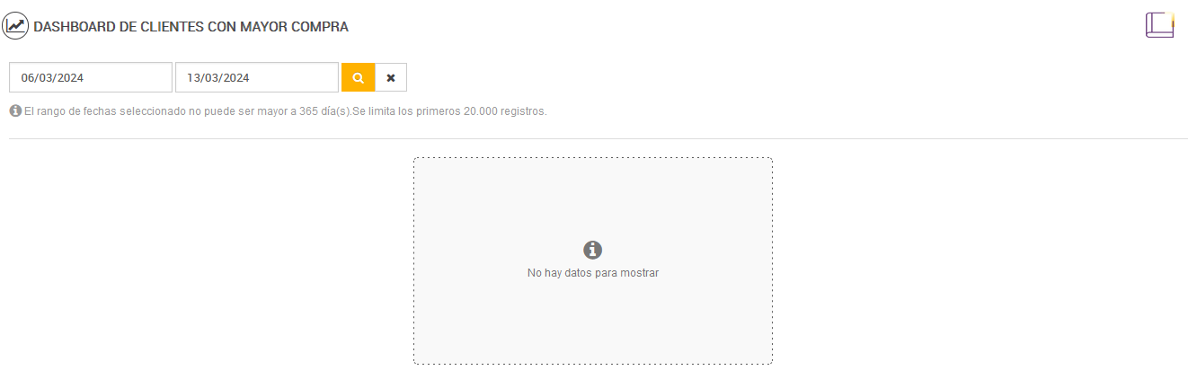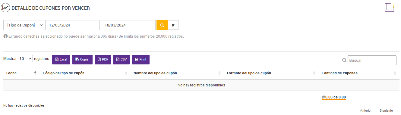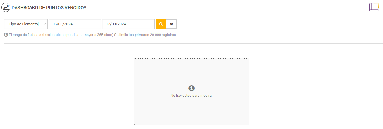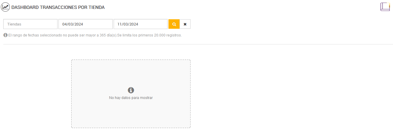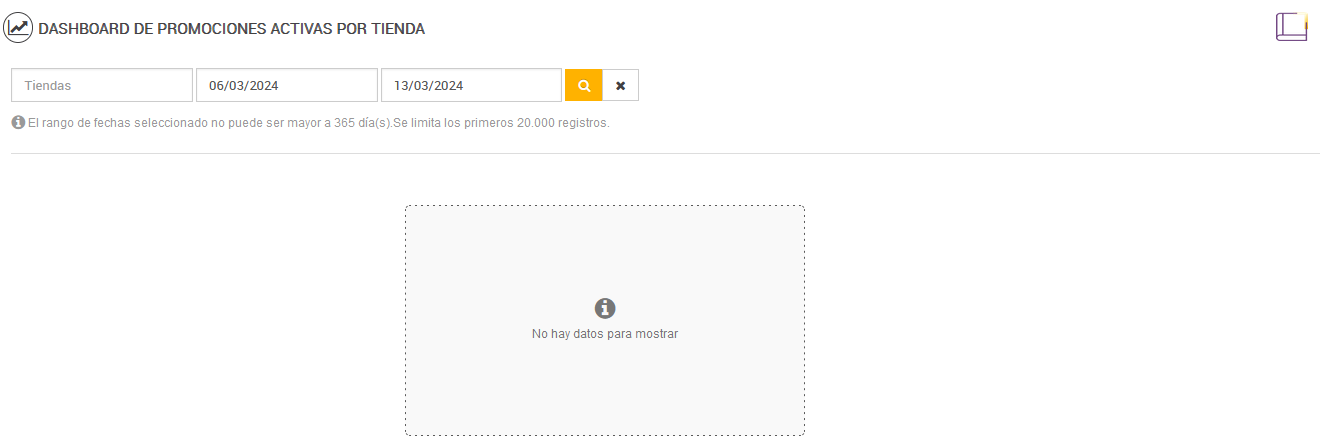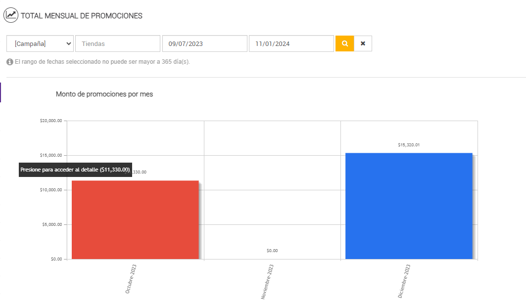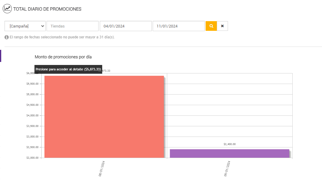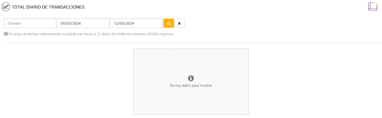 El intervalo de fechas no puede ser mayor a 1 día. A partir de Promo 7.3.1, el filtro fechas por default traerá la última semana y se puede filtrar rangos de fechas de hasta 365 días. La búsqueda traerá como resultado los primeros 20.000 registros en caso de que existan más.