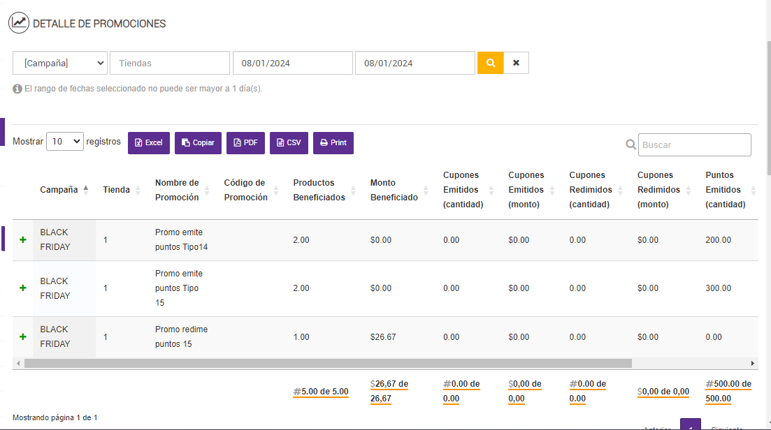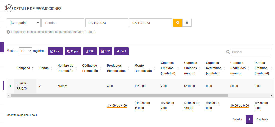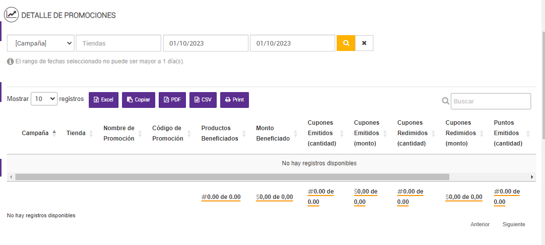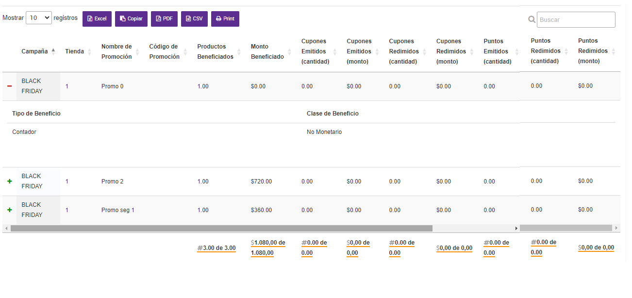 Este reporte pone a disposición de los usuarios, información relevante de las promociones discriminadas por campañas, tiendas y un periodo determinado.