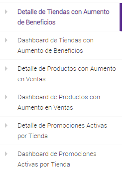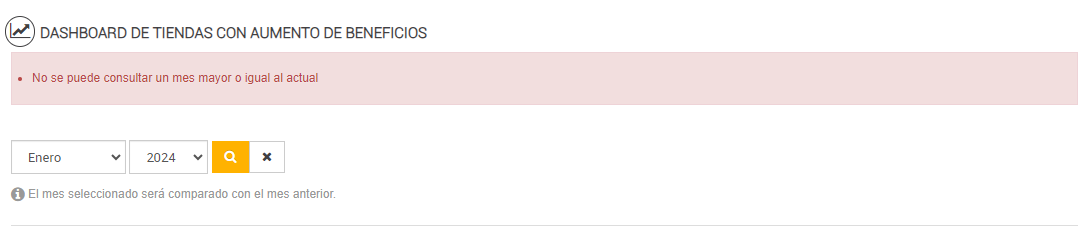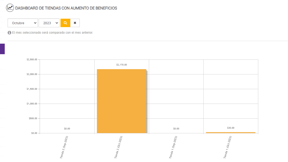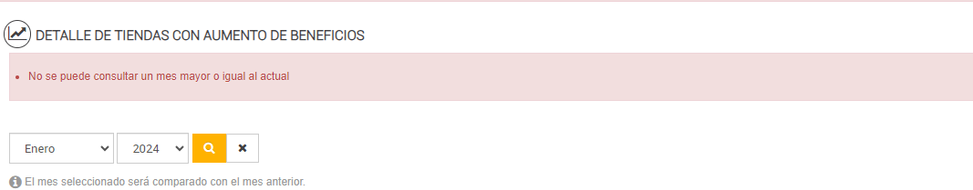 Permite visualizar el detalle de las tiendas que han aumentado sus beneficios de un mes seleccionado, con respecto al anterior.