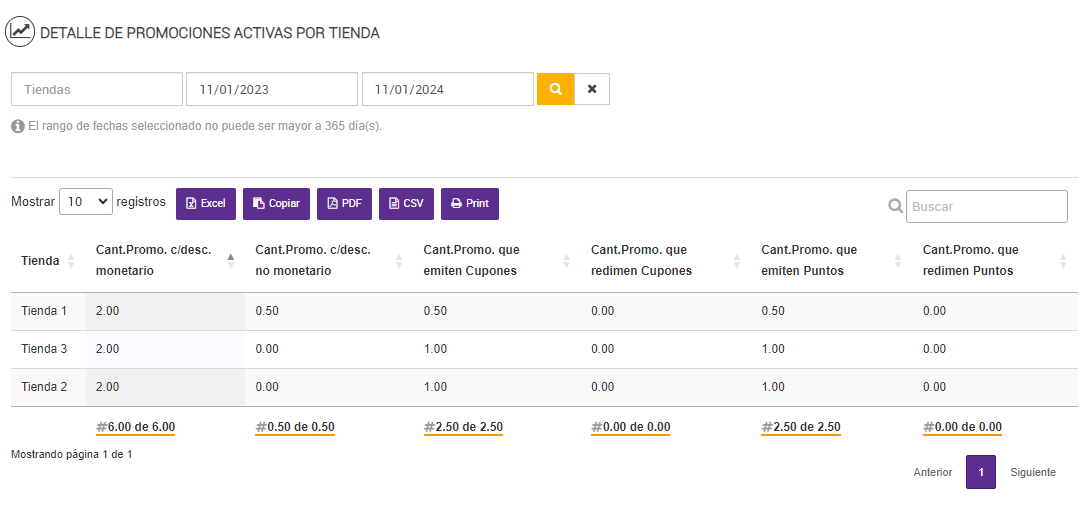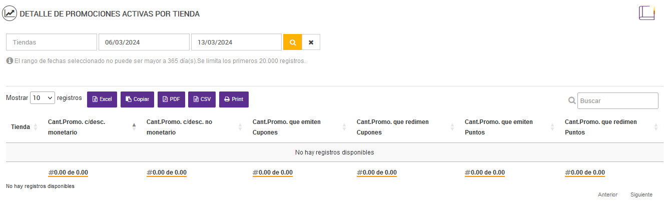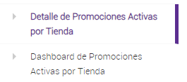 Permite conocer en detalle, la cantidad de promociones activas por tienda, en un período determinado.