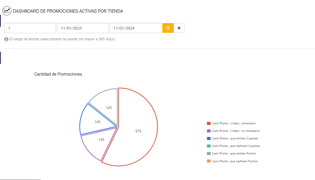 Permite conocer de forma gráfica, la cantidad de promociones activas por tienda, en un período determinado.