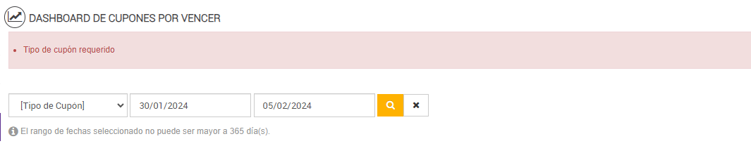 - Fecha: Intervalo de fechas, que se desean consultar. Por default traerá una semana y como máximo se podrá seleccionar 365 días.