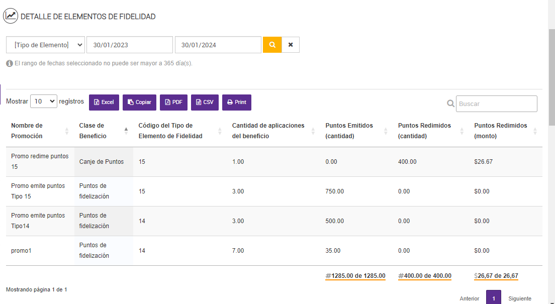 Permite analizar detalladamente la performance de la emisión y redención de puntos según tipo de elemento de fidelidad.