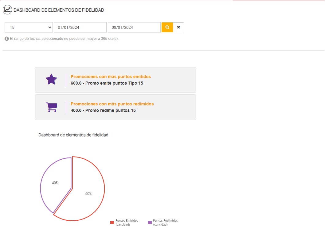 Al presionar el ícono de búsqueda se detallará un gráfico de torta que indicará los puntos emitidos y redimidos (en porcentaje) por el elemento de fidelidad seleccionado, en el período indicado: