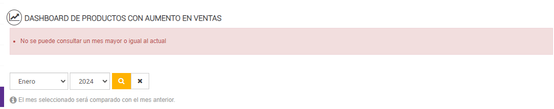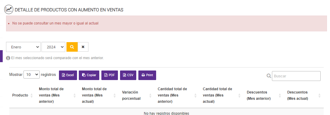 Al presionar el ícono de buscar se desplegará una tabla, que detallará los diez primeros productos que han aumentado sus ventas con respecto al mes anterior:
