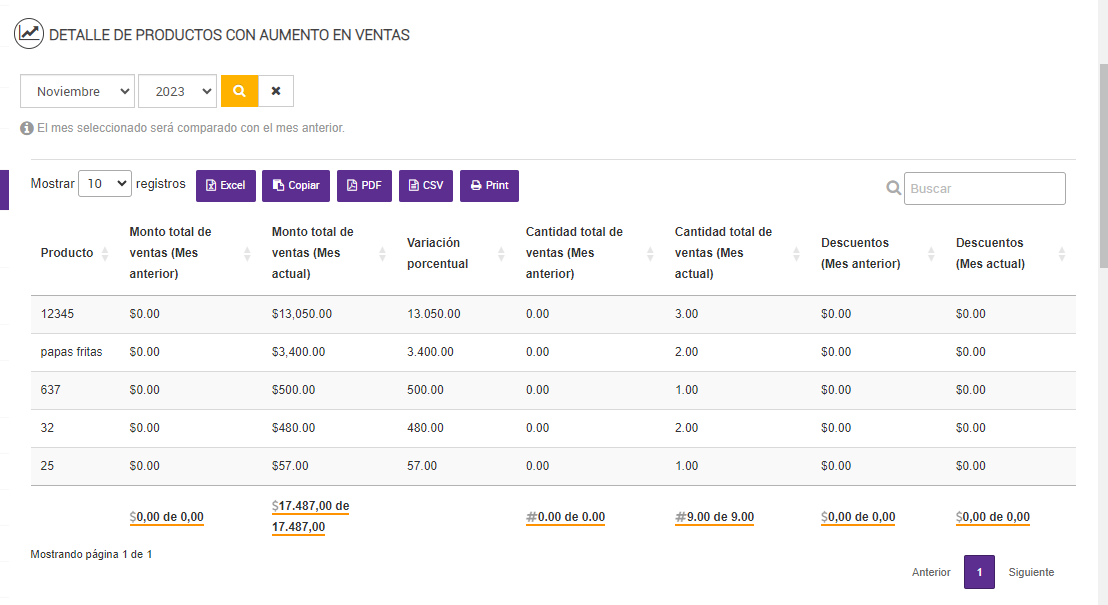 Permite informar detalladamente aquellos productos que han incrementado sus ventas de un mes a otro.