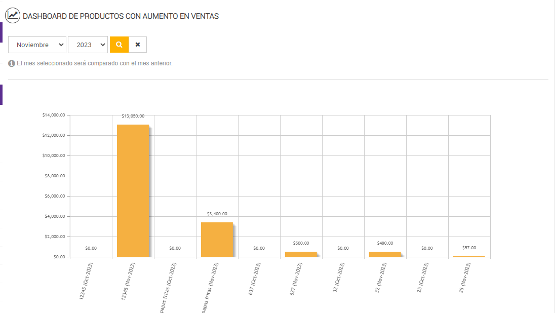 Al presionar el ícono de buscar se desplegará un gráfico de barras, que detallará los diez primeros productos que han aumentado sus ventas con respecto al mes anterior: