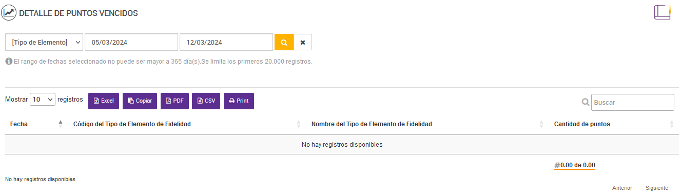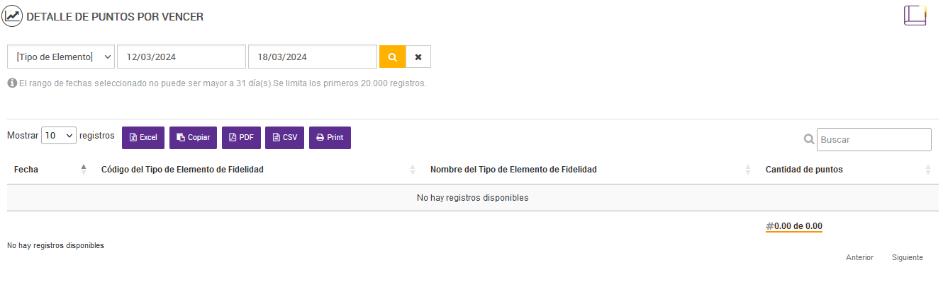 - Tipo de Elemento: campo obligatorio que indica el tipo de elemento de fidelidad que se quiere consultar