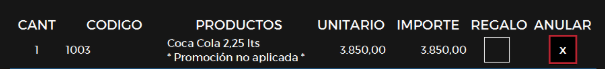 - Cancelar Transacción ( X ): permite cancelar la transacción en curso desde la pantalla de ventas.