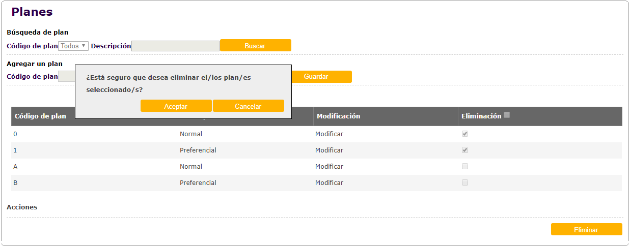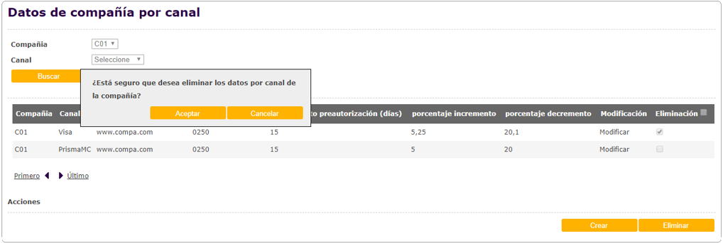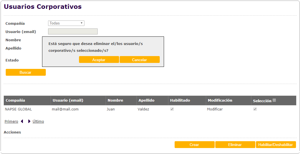 Para eliminar el Template de una compañía, se deberá seleccionar el registro en la pantalla de búsqueda y hacer click sobre el checkbox correspondiente. Luego presionar el botón "Eliminar". No se desplegará ninguna pantalla de confirmación.