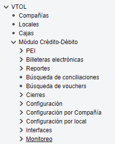 Explica las opciones disponibles para el monitoreo general del sistema y del módulo crédito-débito, como ser: tráfico de canales, estado de locales, etc.