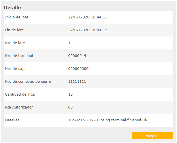 Cuando se oprime el botón "Ver" de un registro de la grilla de resultados, se proporciona un cuadro con información de la operación y detalle relacionado a la venta y las devoluciones asociadas, en caso de que existieran.