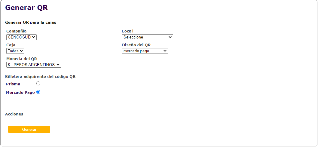 El campo "Billetera adquiriente del código QR" indica qué billetera podrá utilizar dicho QR. Si el QR se crea con billetera adquiriente "Prisma", se podrá pagar con las billeteras Bimo, MODO y Todo Pago. Si el QR se crea con billetera adquiriente "Mercado Pago", sólo se podrá pagar con la billetera de Mercado Pago.