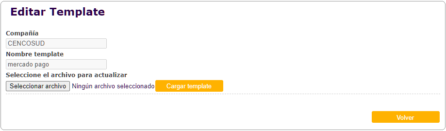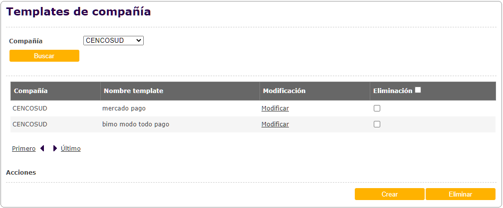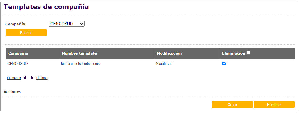 Se podrá realizar la búsqueda de Templates de las compañías, completando los filtros de búsqueda y presionando el botón "Buscar".