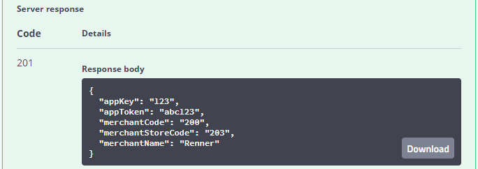 - Si los datos informados en el JSON son correctos, se creará el Merchant, retornando el código HTTP201 y un eco de los parámetros enviados: