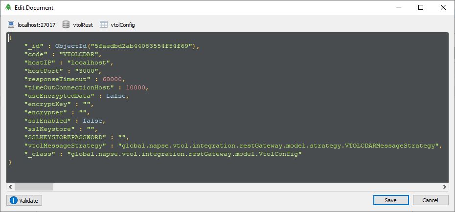 Para configurar los datos, es necesario editar la collection “VtolConfig” de la base de VTOL-VtexIS.