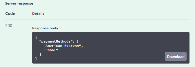 - Si los datos informados son correctos, se creará el Medio de Pago, retornando el código HTTP200 y la lista de paymentMethod soportados: