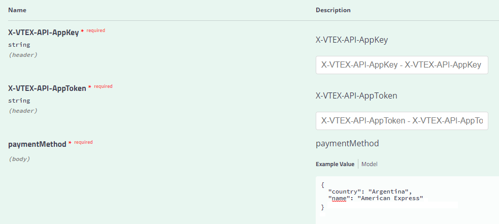 - Completar los datos: X-VTEX-API-AppKey, X-VTEX-API-AppToken y paymentMethod (JSON)