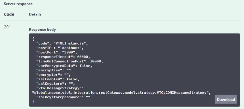 - Si los datos informados en el JSON son correctos, se creará la Instancia de VTOL Server, retornando el código HTTP201 y un eco de los parámetros enviados: