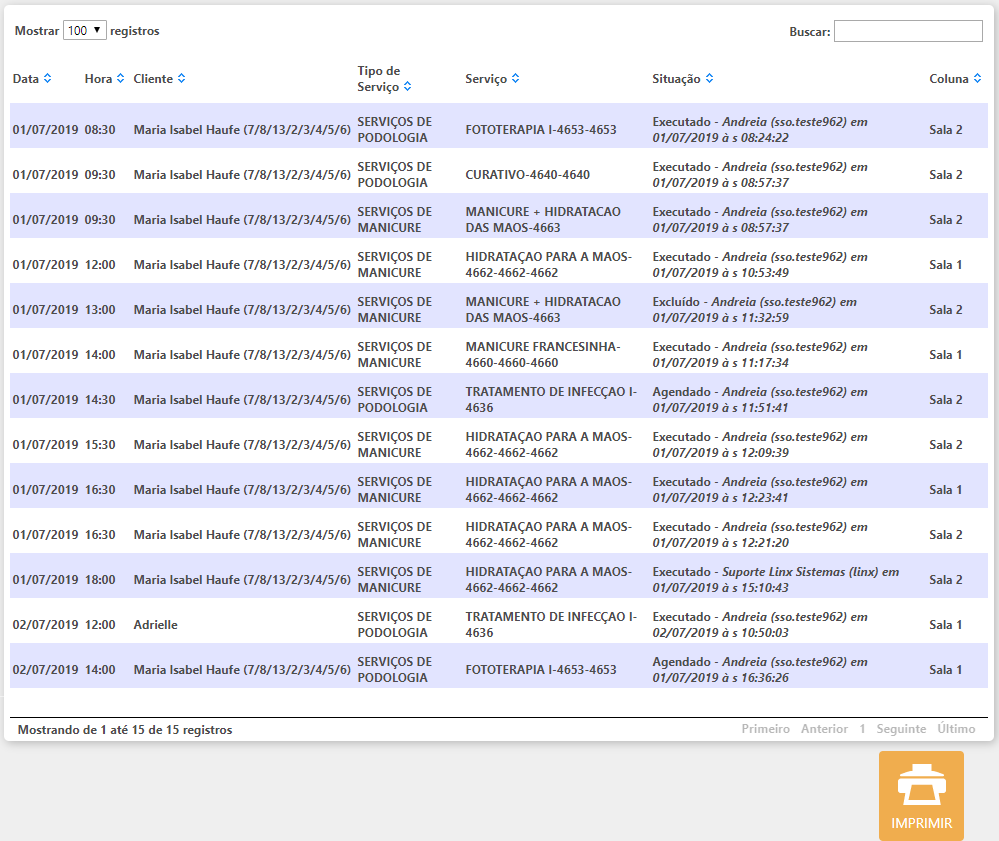 • Tipo de serviço: nesta coluna será exibido o tipo de serviço realizado, entre eles: podologia, manicure etc.;