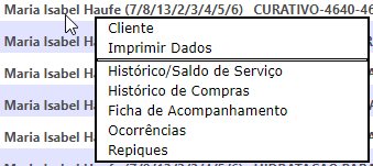• Cliente: será apresentado o cliente que utilizou o serviço. Ao passar o mouse sobre o nome do cliente será exibido um menu de opções;