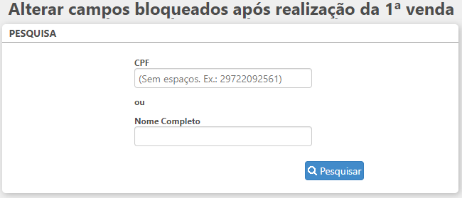Ao clicar nesta opção será apresentada a rotina "Alterar campos bloqueados após realização da 1ª venda", na qual deve ser realizada a pesquisa do cliente por meio do nome completo ou CPF.