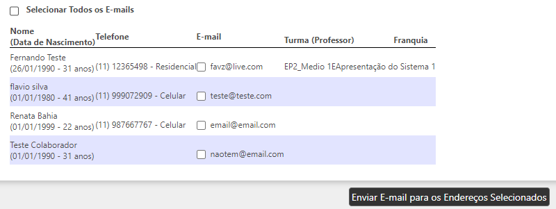 No resultado serão exibidos os aniversariantes de acordo com os filtros selecionados. A listagem mostrará o nome do aniversariante, a data de nascimento, telefone, e-mail, turma, e franquia. É possível enviar e-mail selecionando um ou mais contatos e clicando em "Enviar e-mail para os Endereços Selecionados".