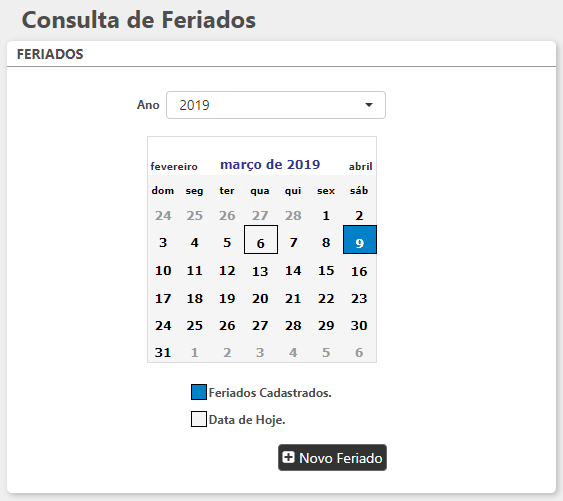 Ao acessar Feriados > Cadastrar Feriados será exibido um calendário com mês e ano atuais no qual poderão ser consultados os feriados já cadastrados. As datas grifadas de azul corresponderão aos dias com feriados cadastrados.