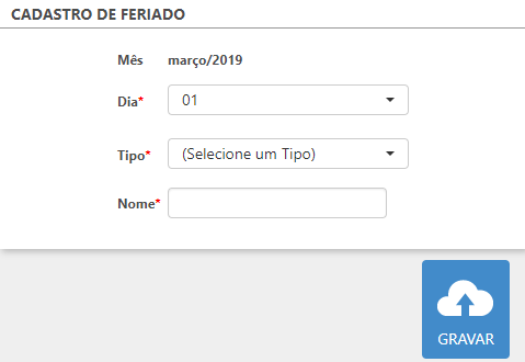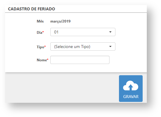 Através do botão "Novo Feriado" é possível cadastrar um novo data indicativa de feriado no calendário, basta selecionar o dia, o tipo (Nacional, Estadual ou Municipal), o nome e gravar.