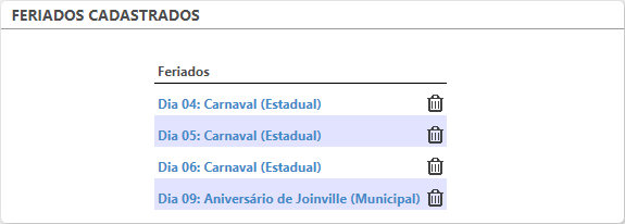 Ao salvar, os feriados cadastrados serão exibidos em uma listagem com a opção de exclusão.
