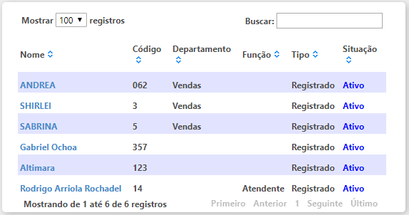 - Nome: nesta coluna será exibido o nome do colaborador e através do link será possível acessar o seu cadastro;