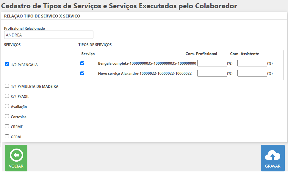 - Tipo de Serviços: devem ser indicados os tipos de serviço que estarão relacionados ao colaborador;