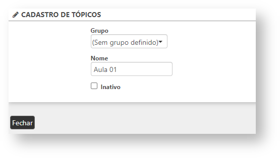 Clicando sobre o link das aulas na coluna "Unidades", será exibida uma nova página com o cadastro de tópicos onde poderá definir o Grupo ao qual pertencerá a aula e o nome da aula.