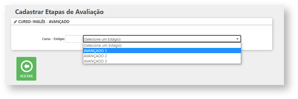 Ao clicar no botão Etapas de Avaliação será possível consultar e / ou cadastrar as diversas formas de Avaliação referente ao curso selecionado.