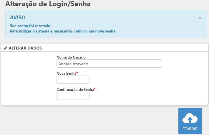 Para inserir uma nova senha o usuário deve realizar o login apenas com o nome de usuário, ao clicar em Entrar a tela será direcionada para a rotina de Alteração de Login/Senha. Ao inserir e confirmar a nova senha clique em Gravar.