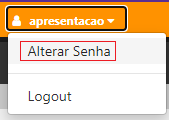 Para realizar a alteração da senha clique sobre o nome do usuário logado e em seguida na opção Alterar Senha.