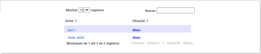Na listagem dos autores cadastrados serão exibidas as seguintes informações: