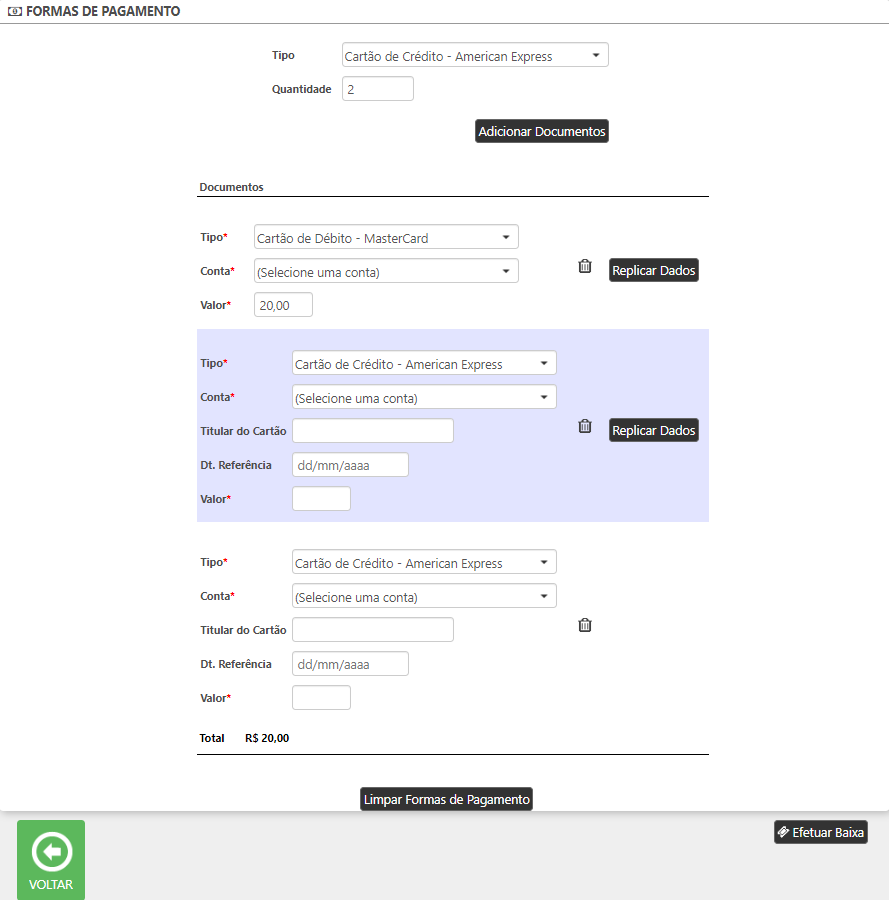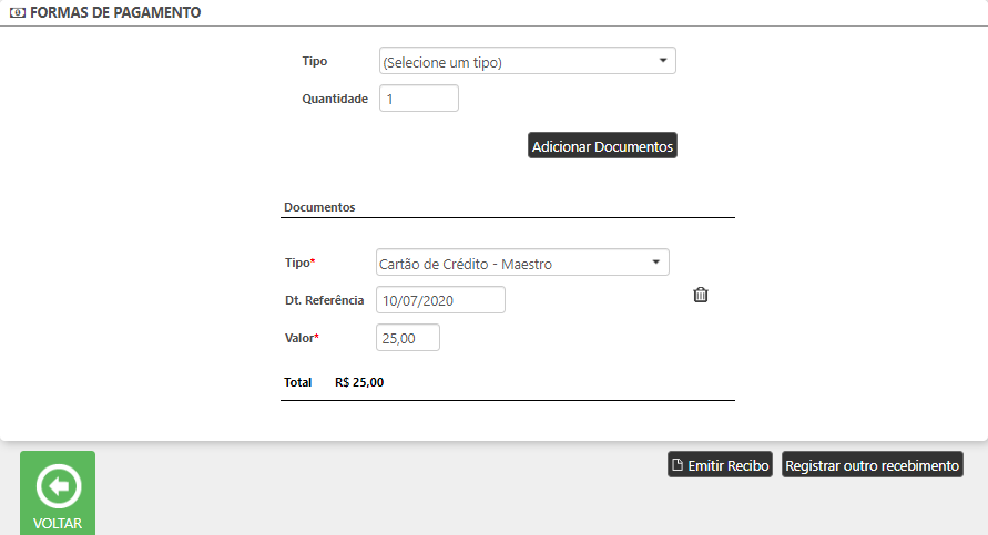 No grupo Documentos serão exibidos os valores do título para pagamento, o tipo de pagamento e a data de referência. É possível alterar e definir diferentes formas de pagamento, para tanto, basta inserir as informações em Tipo de Pagamento e clicar em Adicionar Documentos. A informação será exibida em Documentos. Para excluir um dos tipos de pagamento, basta selecionar o ícone de . Selecionando Limpar Formas de Pagamento serão removidas todas as formas de pagamento inseridas.