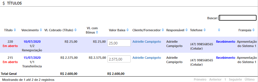 Neste grupo serão exibidos os títulos selecionados para realizar a baixa. Será possível alterar o campo Valor Baixa, inserindo o valor que será pago. Através do campo Buscar é possível pesquisar por um título específico pelo número ou pelo nome do responsável.