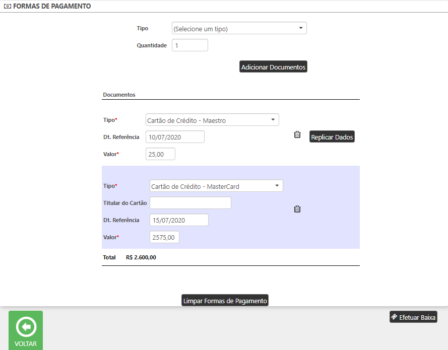 Quantidade: deve ser inserida a quantidade de formas de pagamento do título.