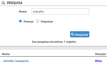 Após a pesquisa serão exibidos os resultados. Ao clicar sobre o link do nome, o campo Aluno/Cliente será preenchido automaticamente.
