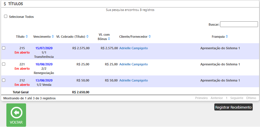 Ao clicar em Pesquisar, serão exibidos os títulos em aberto no nome da pessoa. Basta selecionar o título e clicar em Registrar Recebimento.